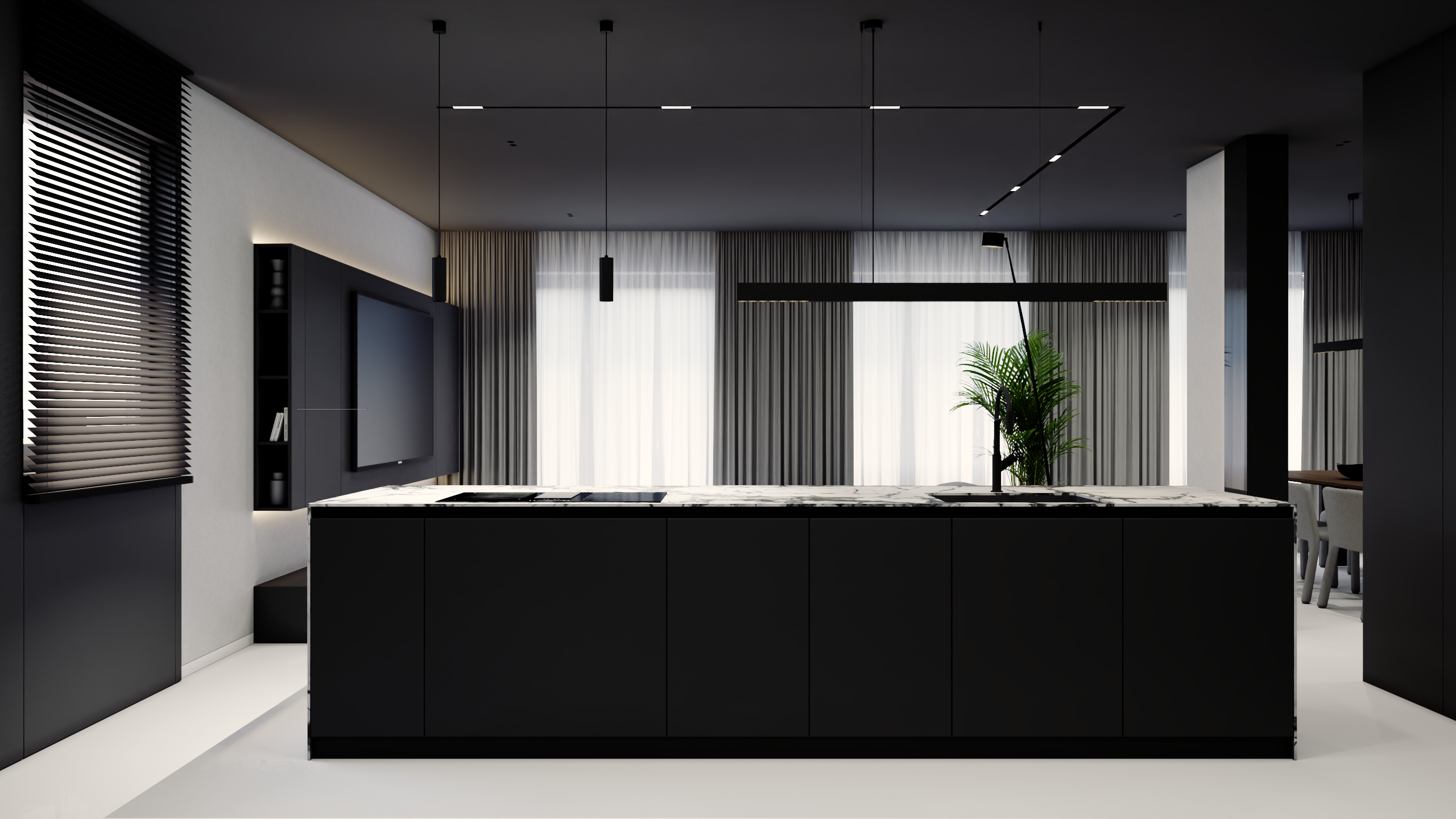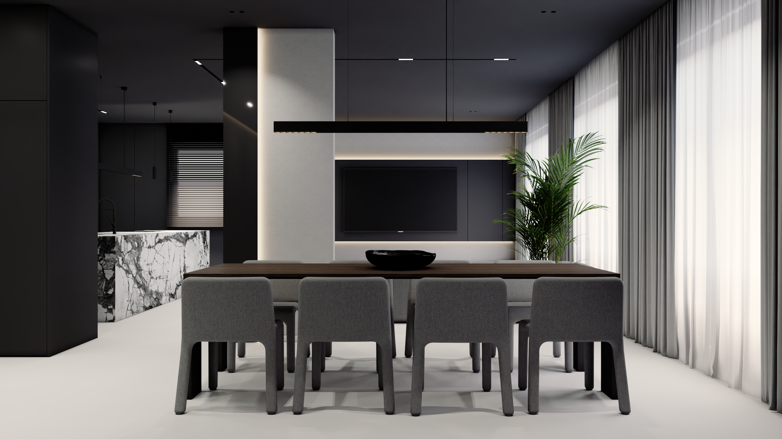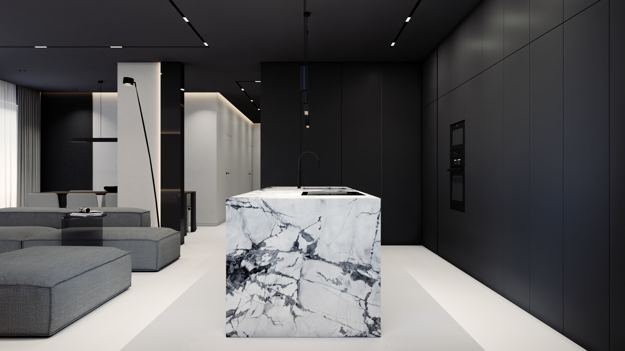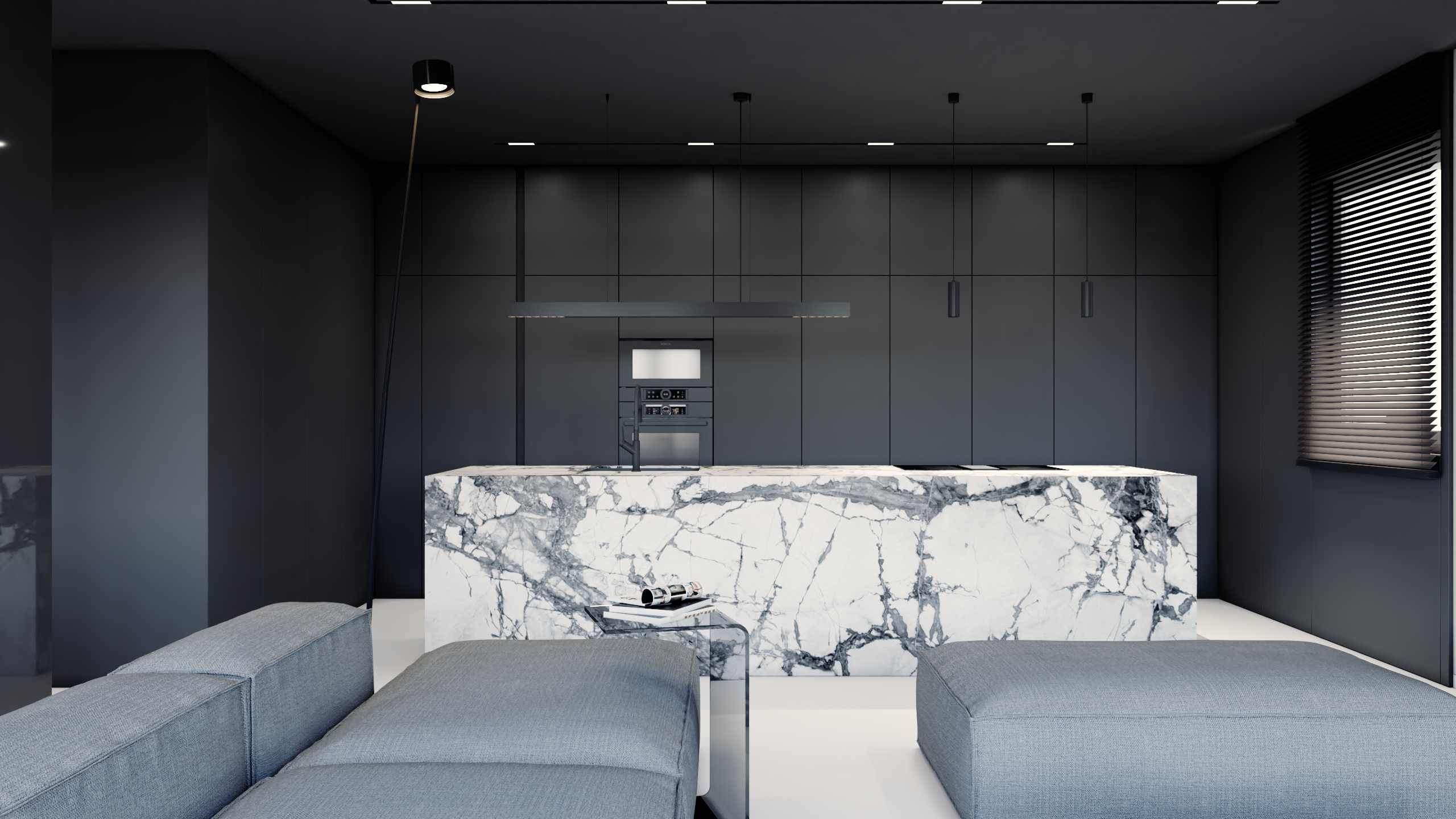 Sercem apartamentu jest otwarta strefa dzienna, która zachwyca bezkompromisowym designem i przemyślanym układem. Uwagę przykuwa tu przede wszystkim spektakularna wyspa kuchenna wykonana z wyrazistego, jasnego kamienia z mocnym użyleniem, która stanowi architektoniczny punkt centralny i piękny kontrast dla minimalistycznej, matowej czerni zabudowy meblowej. Część wypoczynkowa, płynnie łącząca się z jadalnią, została wyposażona w rozłożystą, jasnoszarą sofę modułową, zapraszającą do relaksu.