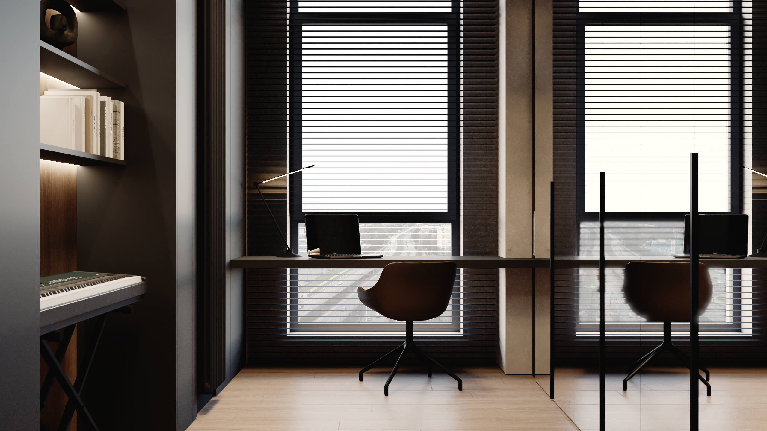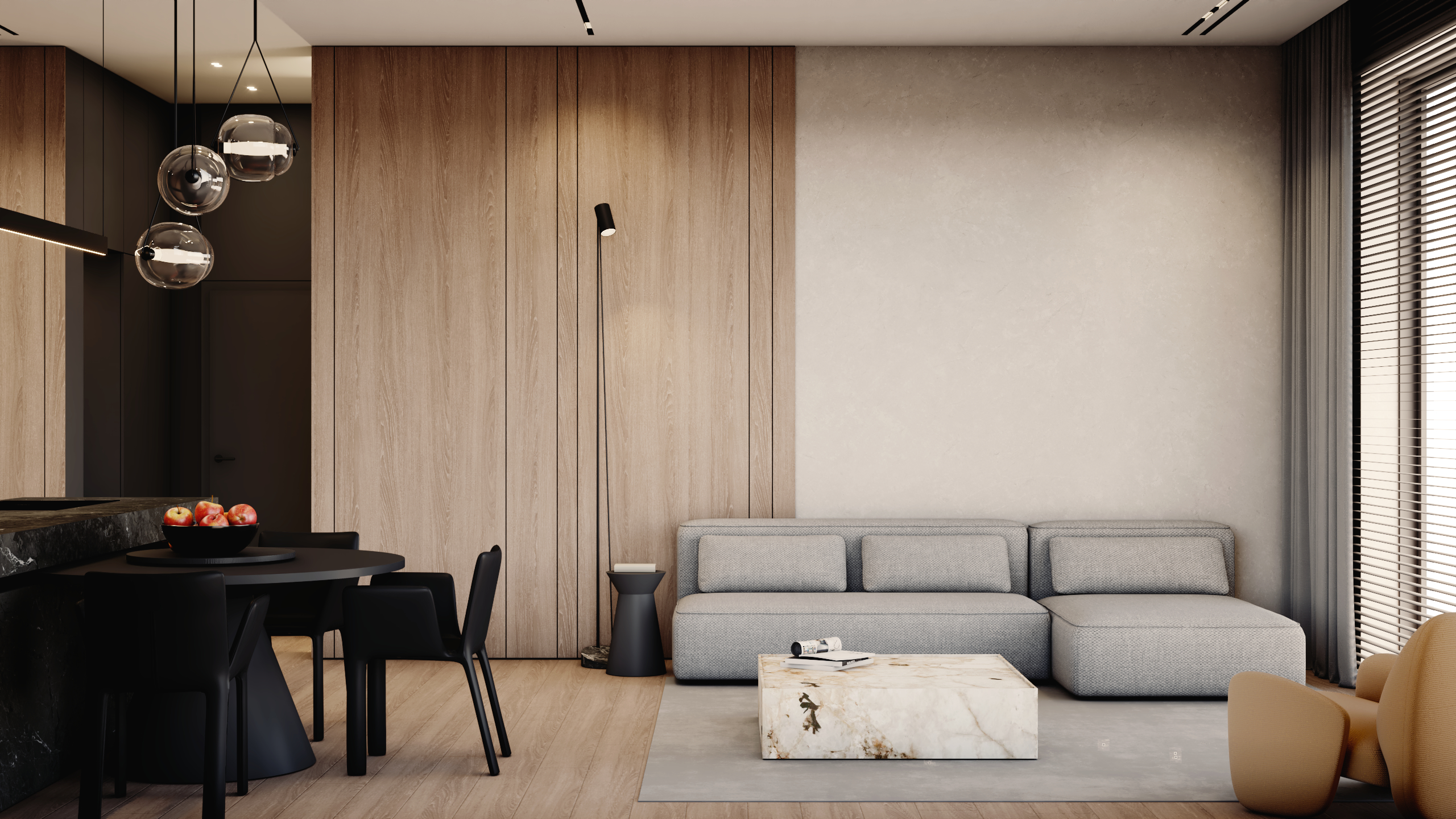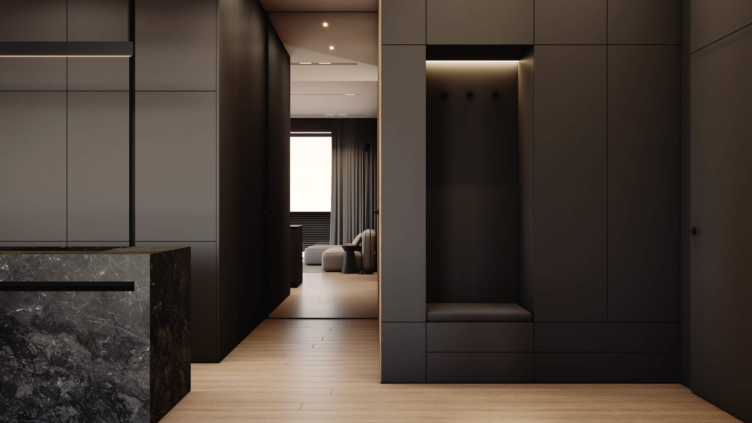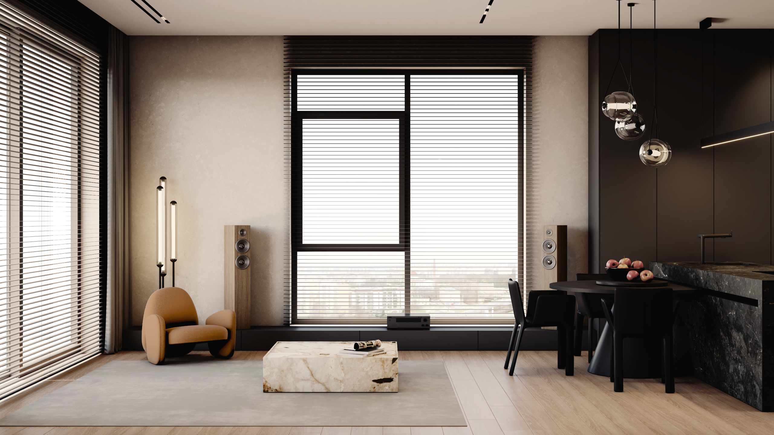 Sercem apartamentu jest reprezentacyjna strefa dzienna, która płynnie łączy funkcję wypoczynkową z przestrzenią do podejmowania gości. Zgodnie z wymaganiami współczesnego stylu życia, w układzie funkcjonalnym przewidziano dwa niezależne gabinety, zapewniające idealne warunki do pracy w pełnym skupieniu.