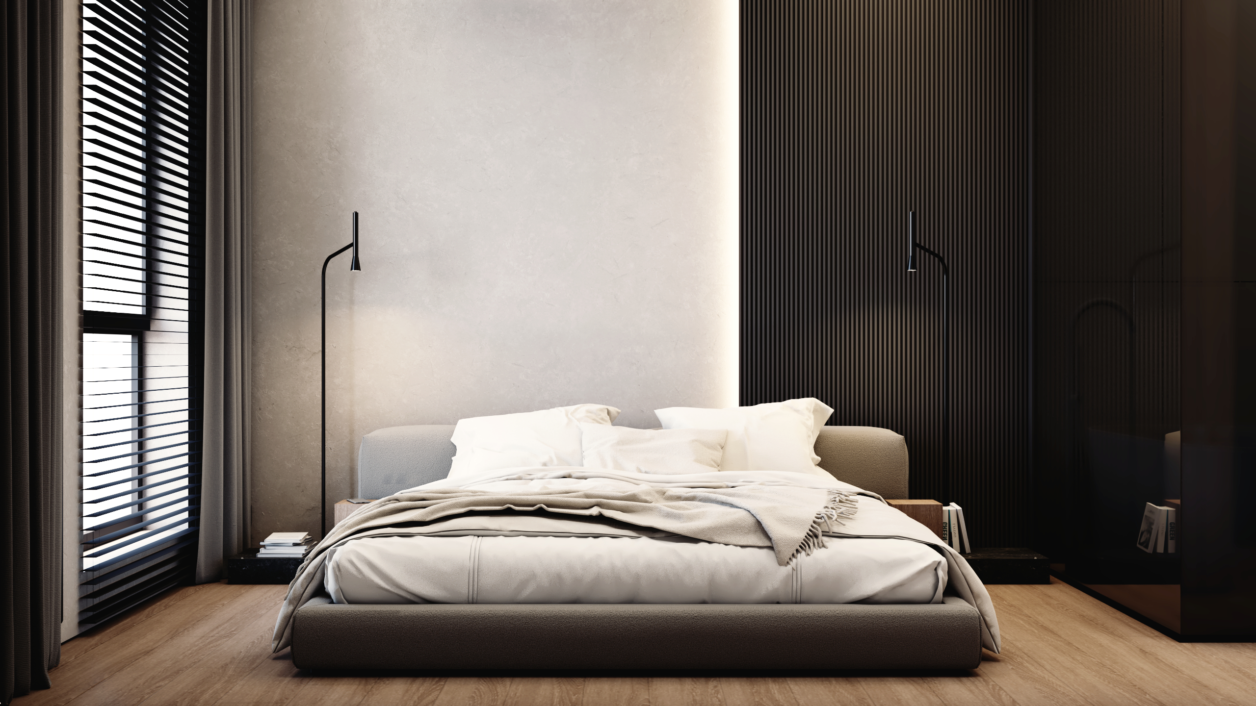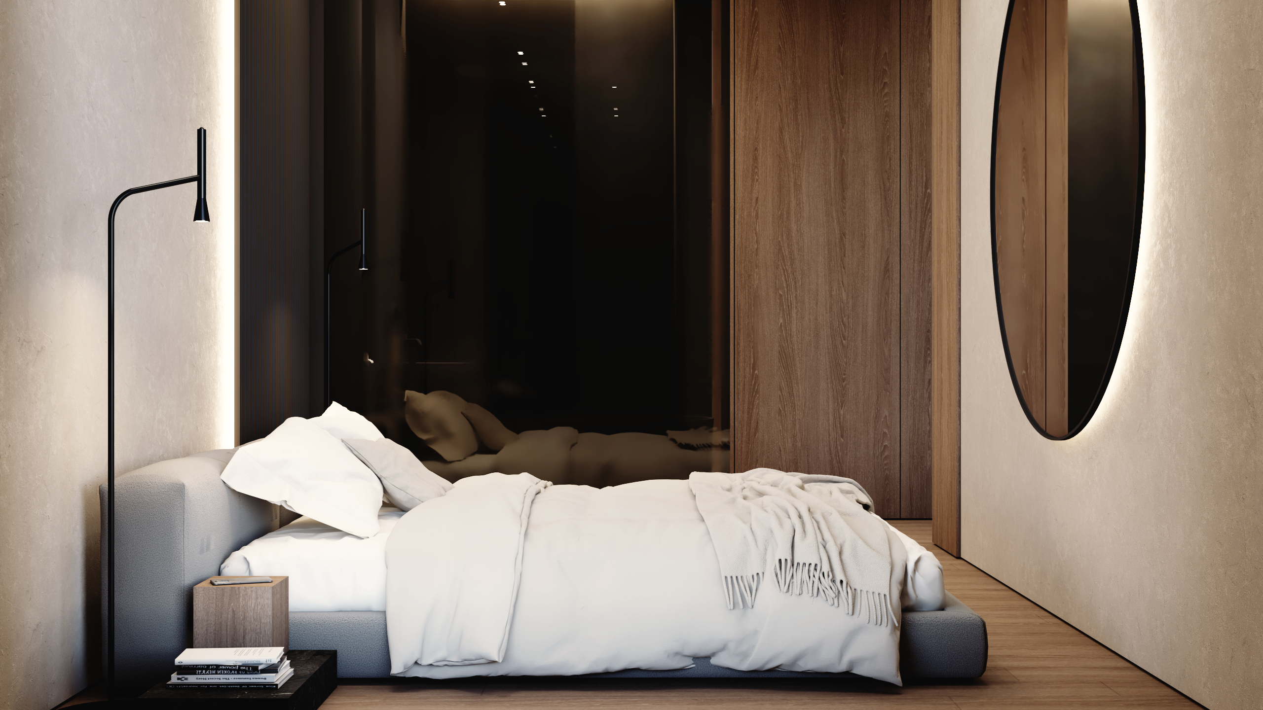 Prywatna część mieszkania to minimalistyczna sypialnia oraz dopracowane w najmniejszych detalach pomieszczenia uzupełniające – designerska toaleta i praktyczne pomieszczenie gospodarcze.